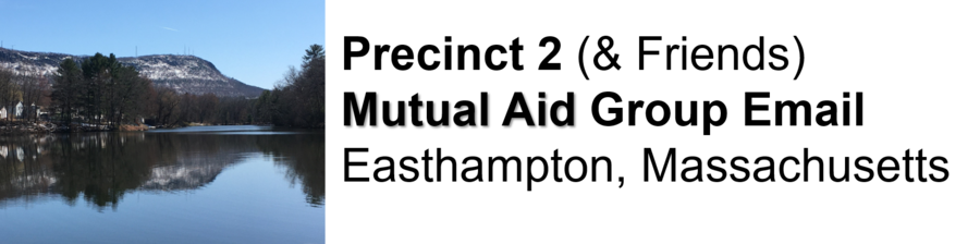 This is a mutual aid group for Precinct 2 in Easthampton, Massachusetts.If you are in immediate danger or need emergency support please call 911. This group is a neighborhood mutual aid group and is not intended to be a substitution for emergency services.